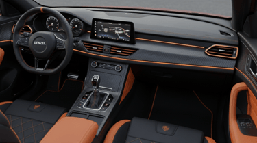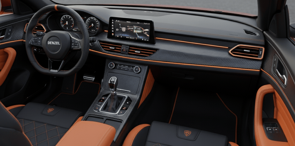 Couro natural, fibra de carbono e luzes que respiram o ritmo do motorista.