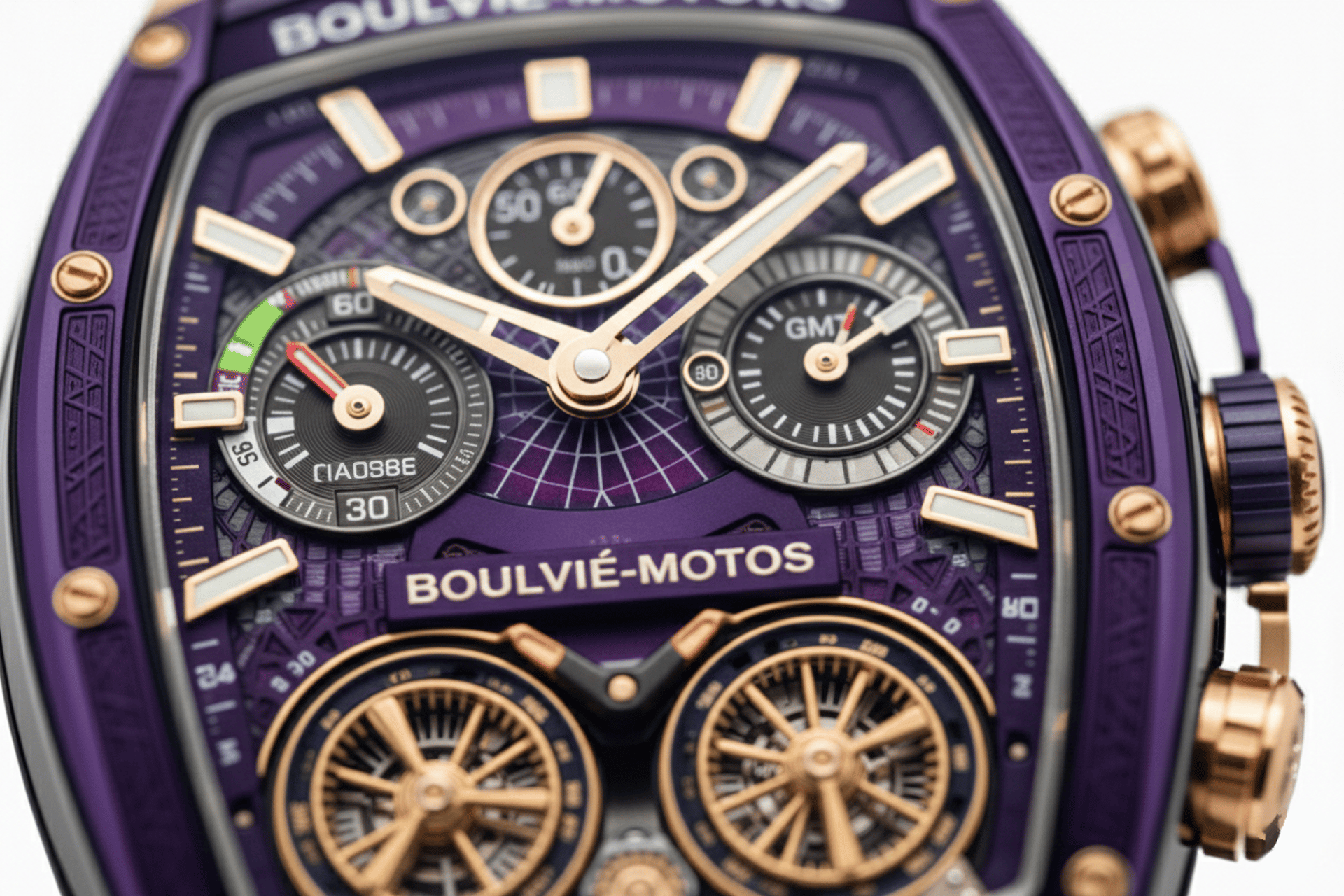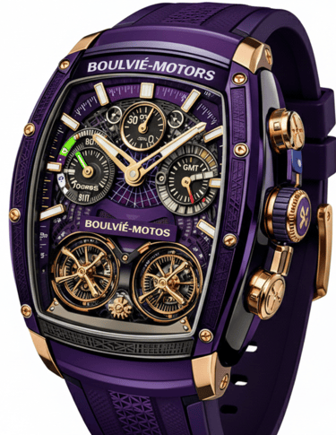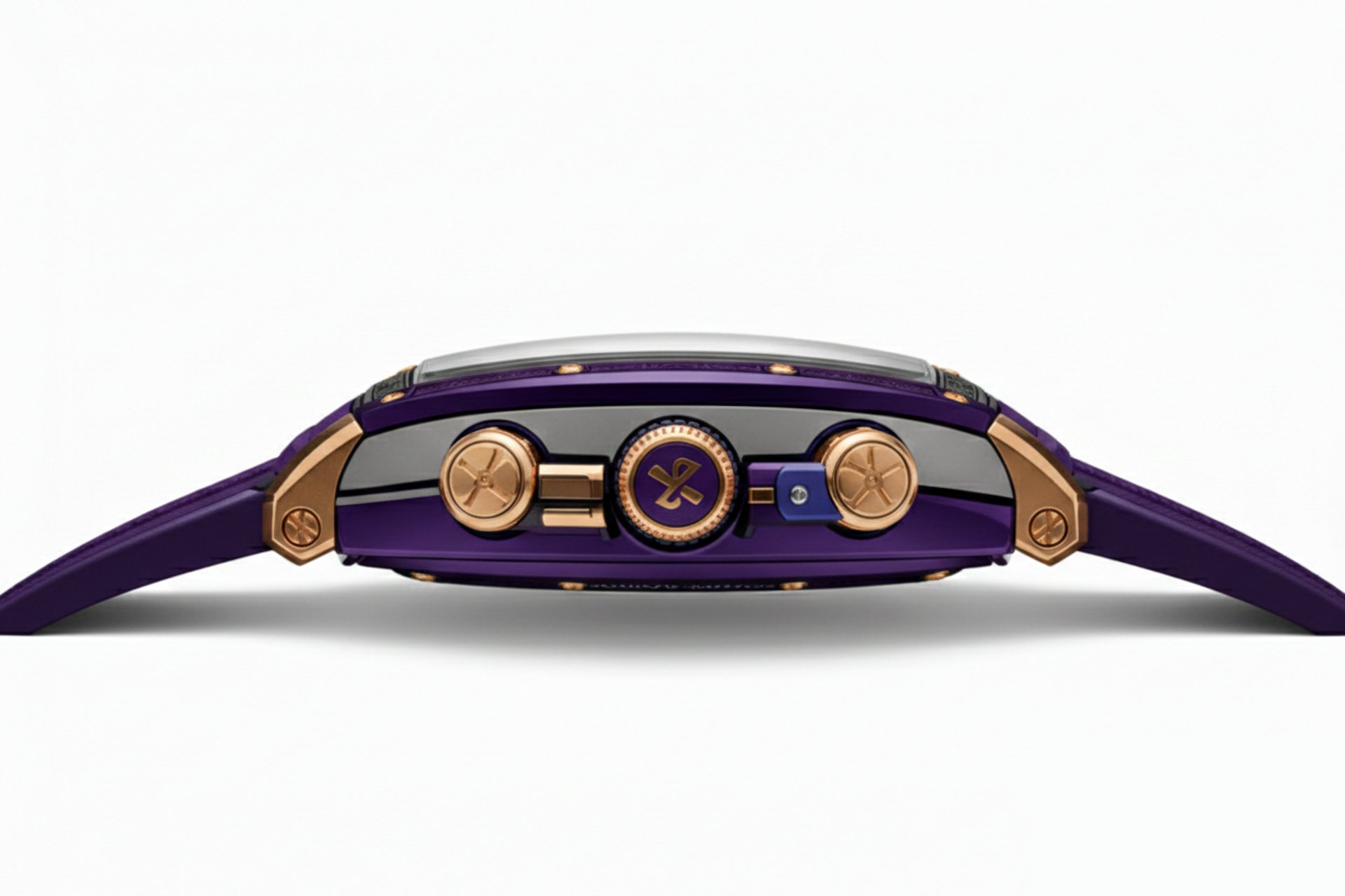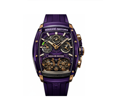 O roxo imperial envolve a arquitetura mecânica exposta com profundidade, contraste e presença aristocrática. Os componentes em Ouro Rose 18k criam tensão visual entre luxo clássico e brutalismo técnico.