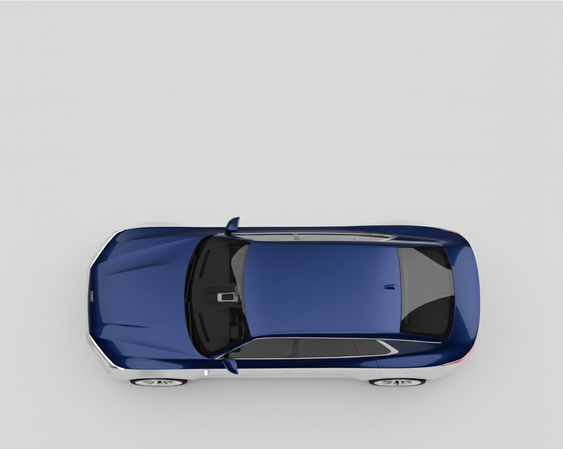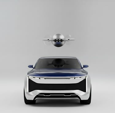 Acoplado ao teto, repousa o Drone Boulvié Étheris, uma extensão viva do próprio carro — um “olho alado” que ascende sempre que o motorista assume o volante.