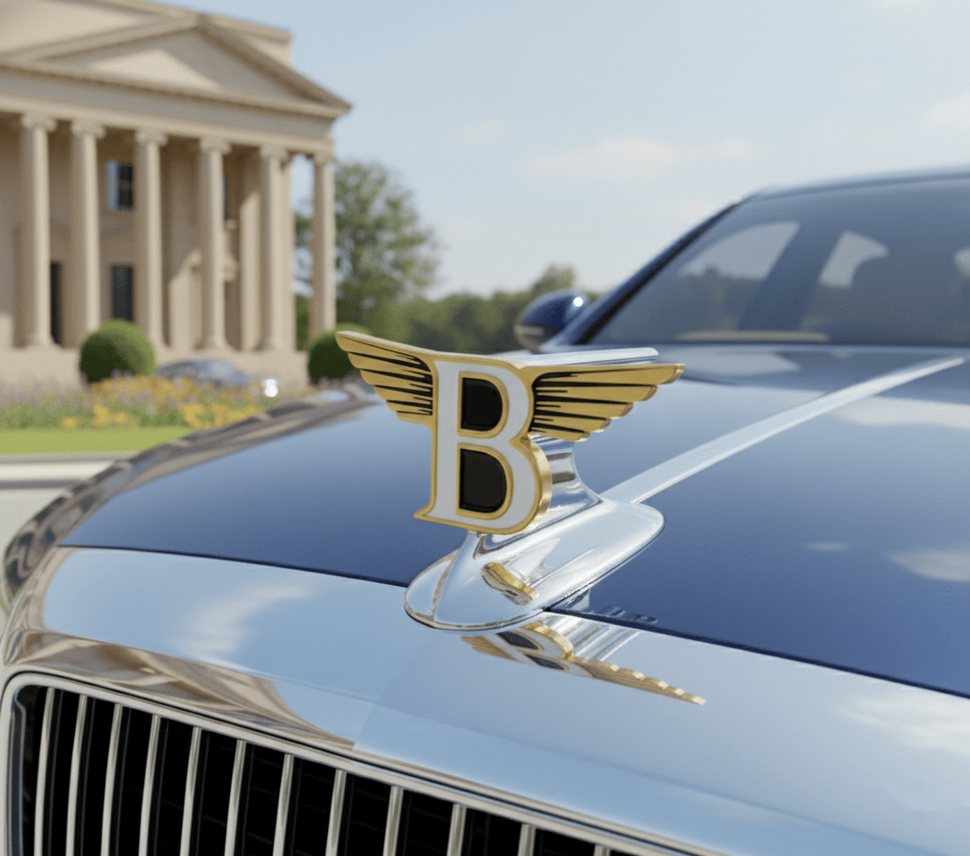Emblema frontal: “B” alada, ouro maciço 18k com asas articuladas em titânio cromado.