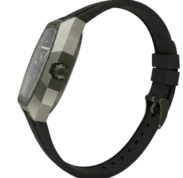 Com acabamento metálico claro, esta versão amplia a leitura das linhas angulares da caixa, destacando a construção do relógio como objeto estrutural.