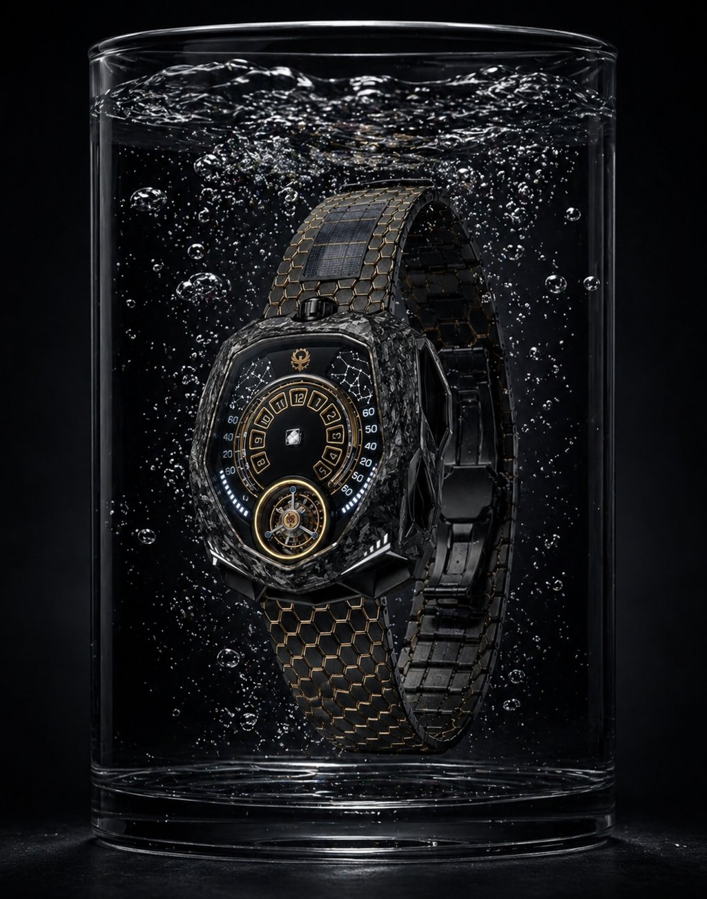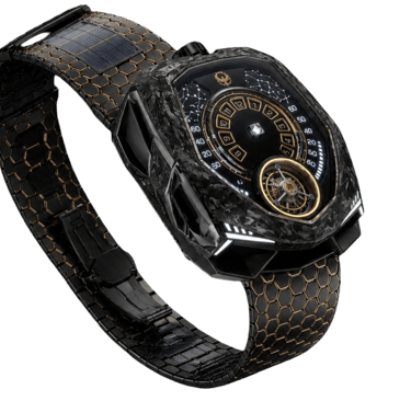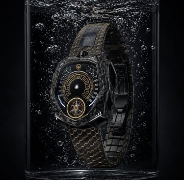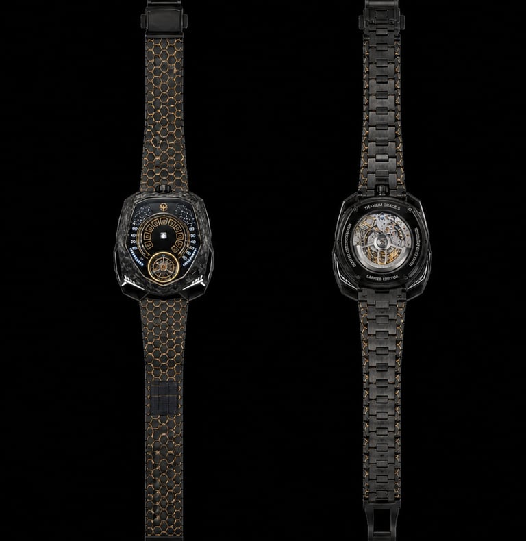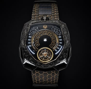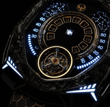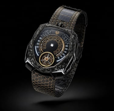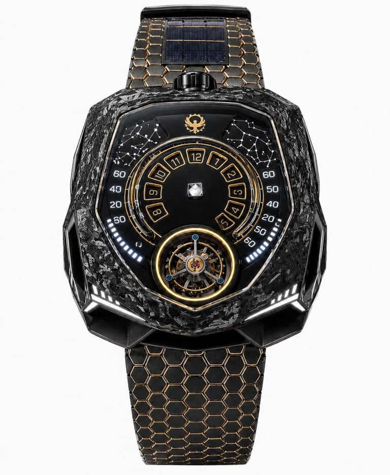 Construído em compósito de carbono avançado com detalhes em ouro 18K, o Caldris traduz o equilíbrio entre tecnologia e presença. Sua estética escura absorve a luz enquanto os contornos dourados a devolvem com precisão.