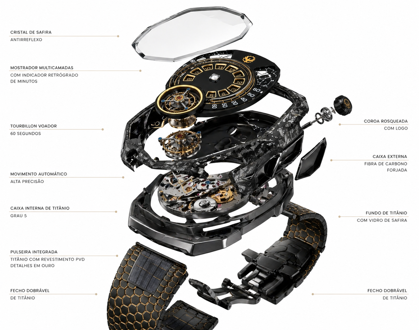 A caixa é construída em compósito de fibra de carbono forjada, combinando leveza com extrema resistência. Internamente, uma liga metálica de alta performance garante rigidez estrutural, enquanto o acabamento fosco texturizado contrasta com polimentos técnicos refinados.