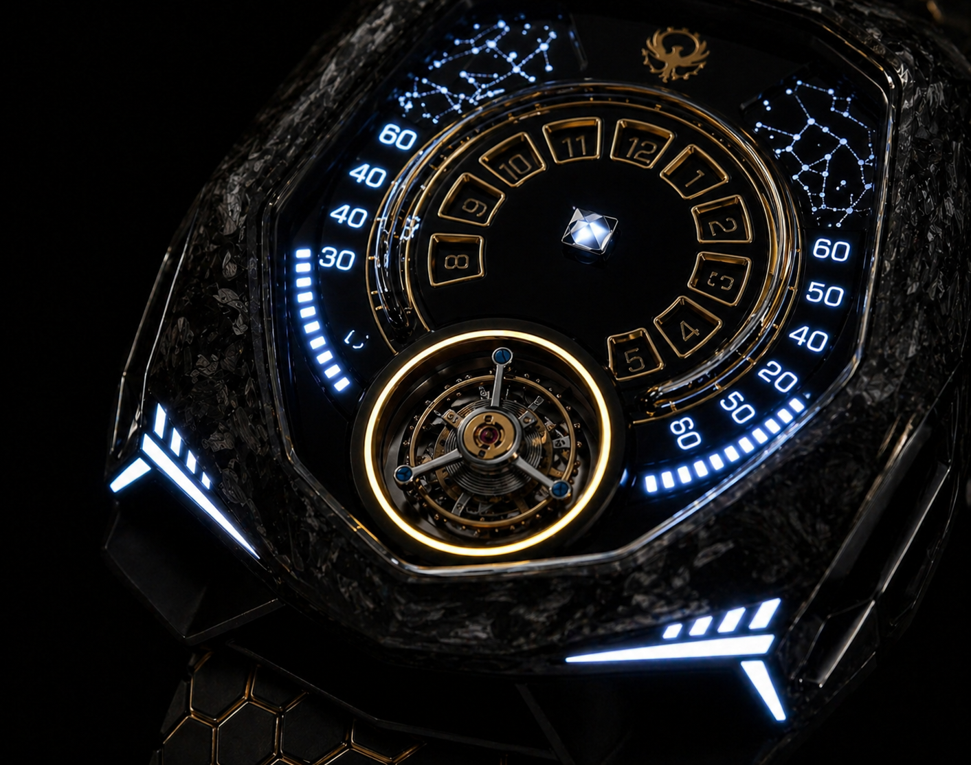 Os índices metálicos de alto contraste reforçam a legibilidade, acompanhados por um anel luminoso perimetral que se integra perfeitamente ao design. À direita, padrões inspirados em constelações adicionam um caráter quase cósmico, enquanto a pedra central lapidada atua como ponto de convergência visual — preciso, técnico e absolutamente marcante.
