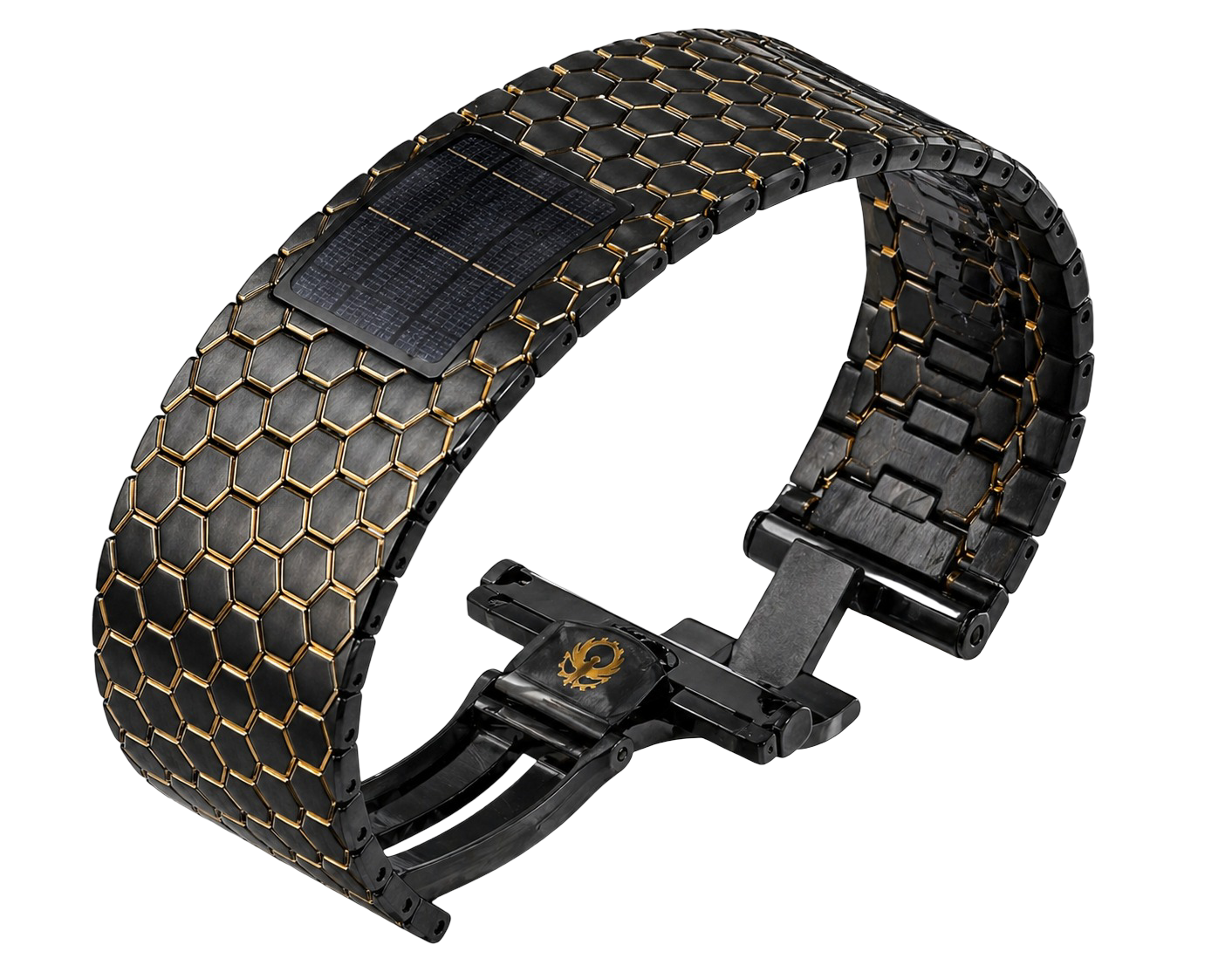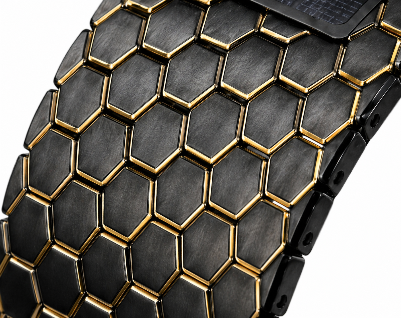 Cada elo hexagonal é individualmente contornado por fios de ouro 18K, aplicados com exatidão milimétrica. Esse contraste entre o negro técnico e o dourado nobre não é decorativo — é assinatura visual, é identidade. A luz percorre esses contornos criando reflexos sutis que mudam conforme o movimento, reforçando a sensação de profundidade e exclusividade.