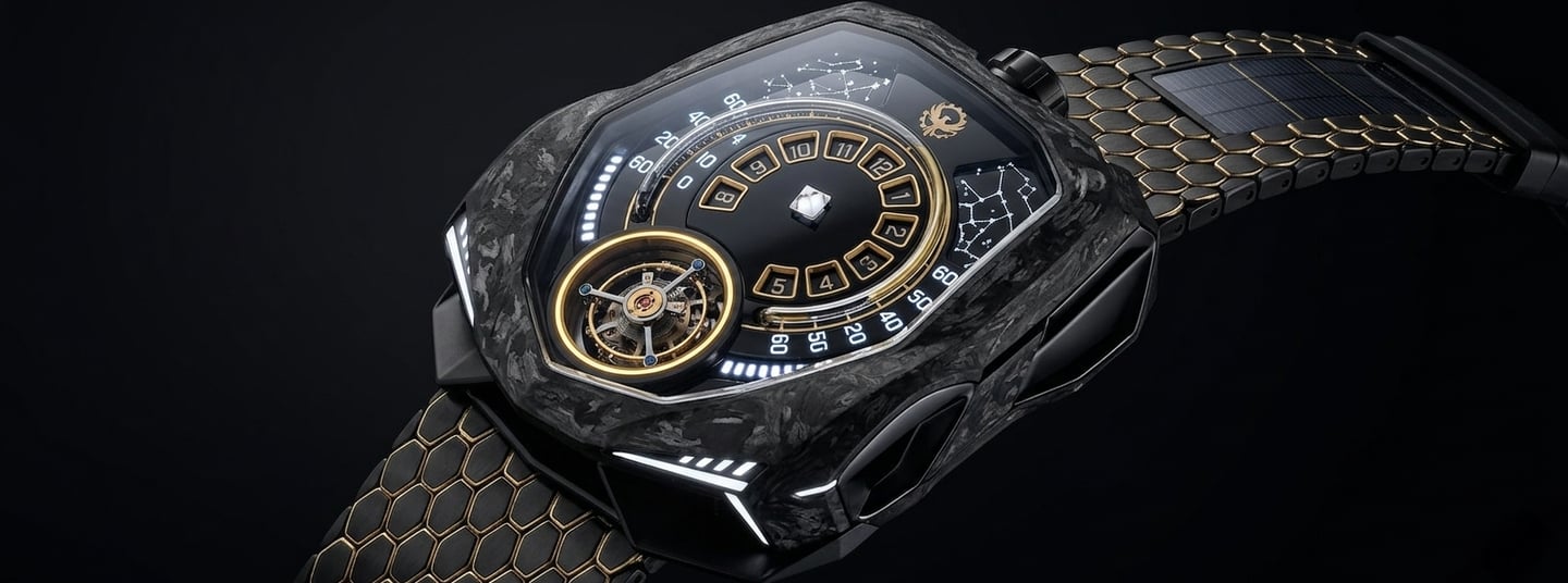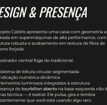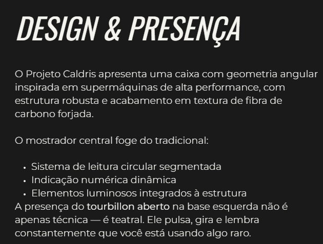 Criado para quem não aceita o comum, o Caldris combina alta relojoaria, design automotivo e materiais de elite em uma peça que parece saída de um cockpit futurista.