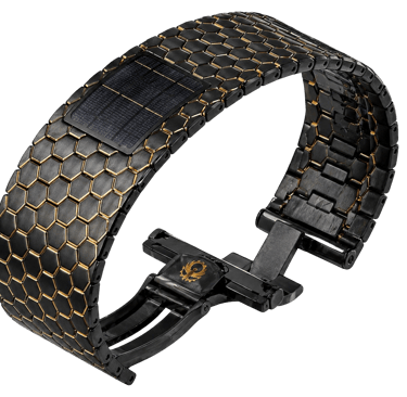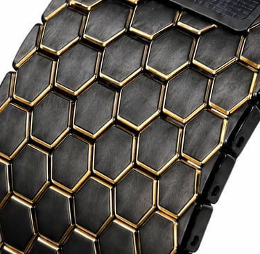 A pulseira do Projeto Caldris ela prolonga sua arquitetura. Estruturada em módulos hexagonais perfeitamente articulados, cria uma continuidade visual e tátil que envolve o pulso com precisão e firmeza. Sua tonalidade negra profunda não é apenas acabamento: nasce da fusão de quatro minerais — titânio, tungstênio, carbono e óxido de zircônio — combinados para alcançar resistência extrema, leveza controlada e um preto denso, sofisticado e duradouro.